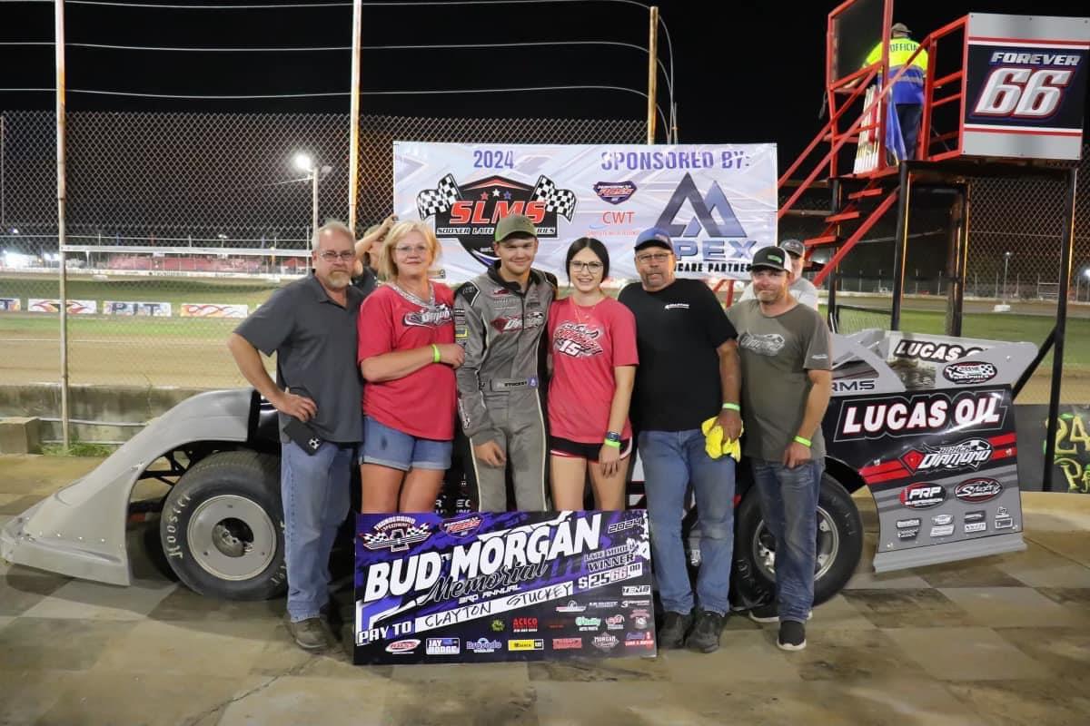 Shreveport, La. (07/31/24) – Clayton Stuckey added his second win of the season over the weekend with a impressive charge to the front in Friday’s Bud Morgan Memorial at Thunderbird Speedway aboard his Lucas Oil / Advanced Powder Coating / FiberTec Laser Cutting No. 15 Black Diamond Racecars Late Model.
